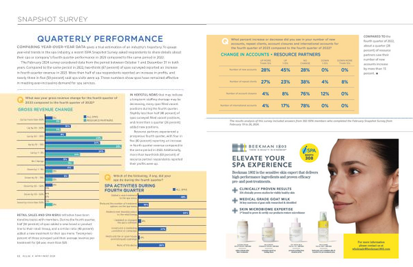 COMPARING YEAR-OVER-YEAR DATA gives a true estimation of an industry ’ s trajectory . To gauge year-end trends in the spa industry , a recent ISPA Snapshot Survey asked respondents to share details about their spa or company ’ s fourth quarter performance in 2023 compared to the same period in 2022 .