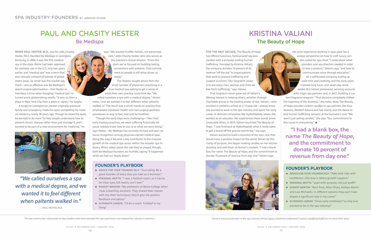 FOUNDER’ S PLAYBOOK l ADVICE FOR YOUR YOUNGER SELF:“ Take bold risks with confidence— the leap is where growth happens.” l PERSONAL MOTTO:“ Lead with purpose, not just profit.” l BIGGEST MENTOR:“ April Peck, Allan Share, Kelleye Martin and Lisa Michaelis. In different seasons they each have played a significant role in my career.” l ALTERNATE CAREER:“ Since early childhood I’ ve only ever wanted to be in the spa industry!”