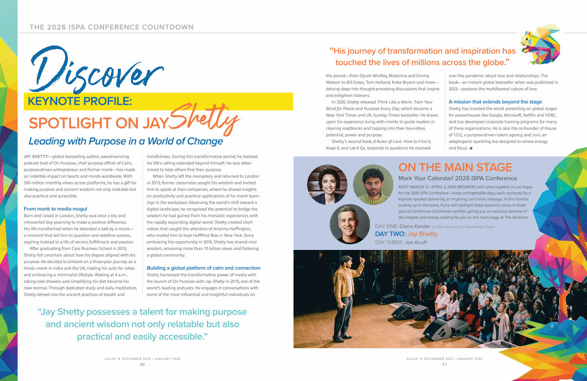 NEXT MARCH 31 – APRIL 2, ISPA MEMBERS will come together in Las Vegas for the 2026 ISPA Conference— three unforgettable days, each anchored by a keynote speaker delivering an inspiring, can’ t-miss message. In the months leading up to the event, Pulse will spotlight these dynamic voices in three special Conference Countdown profiles, giving you an exclusive preview of the insights and energy waiting for you on the main stage at The Venetian.