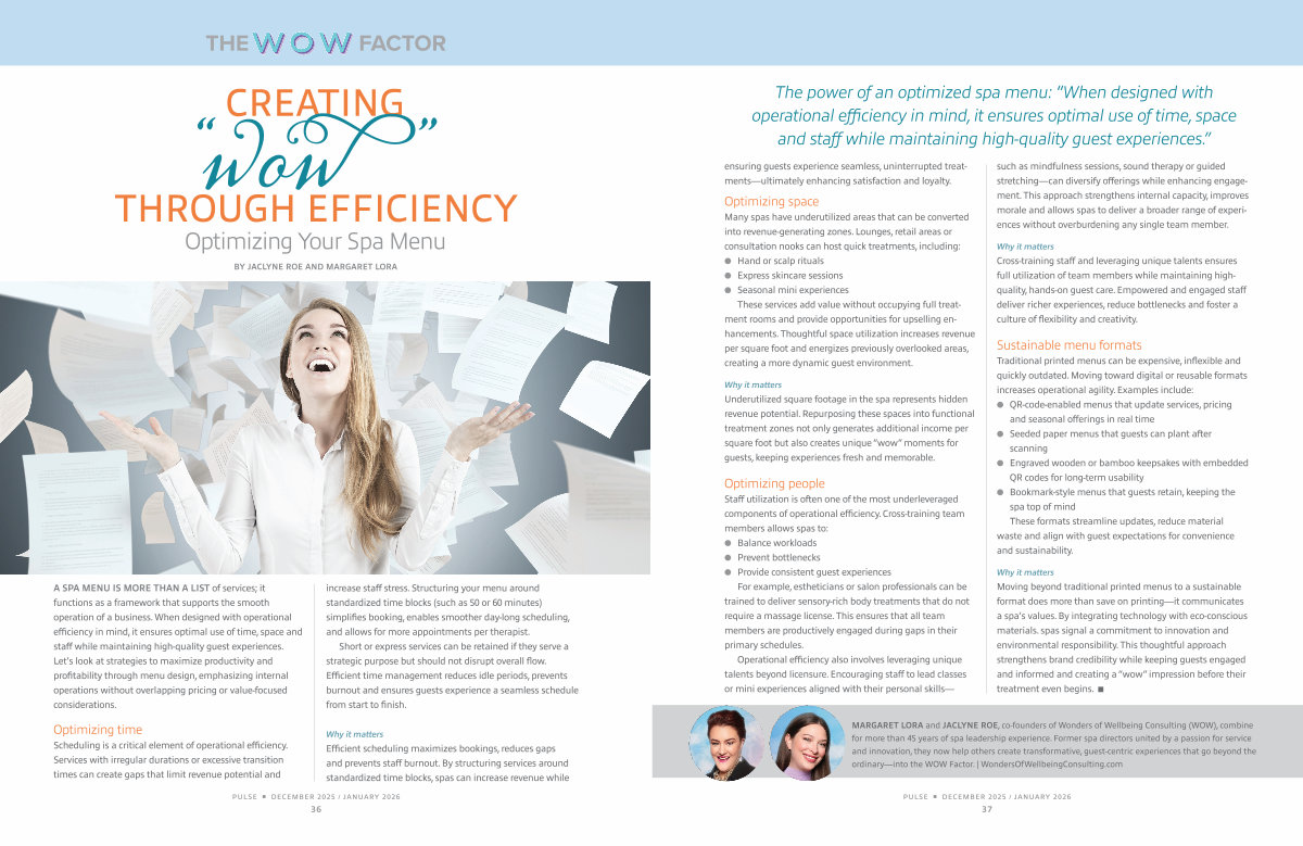A SPA MENU IS MORE THAN A LIST of services; it functions as a framework that supports the smooth operation of a business. When designed with operational efficiency in mind, it ensures optimal use of time, space and staff while maintaining high-quality guest experiences. Let’ s look at strategies to maximize productivity and profitability through menu design, emphasizing internal operations without overlapping pricing or value-focused considerations.