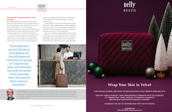 Looking ahead, U. S. luxury-class ADR is forecast to grow 2.5 percent in 2026— barely enough to beat the expected inflation rate— which in turn puts pressure on margins. Highend hotels have a high labor cost component, and this cost will likely only increase in the coming quarters.