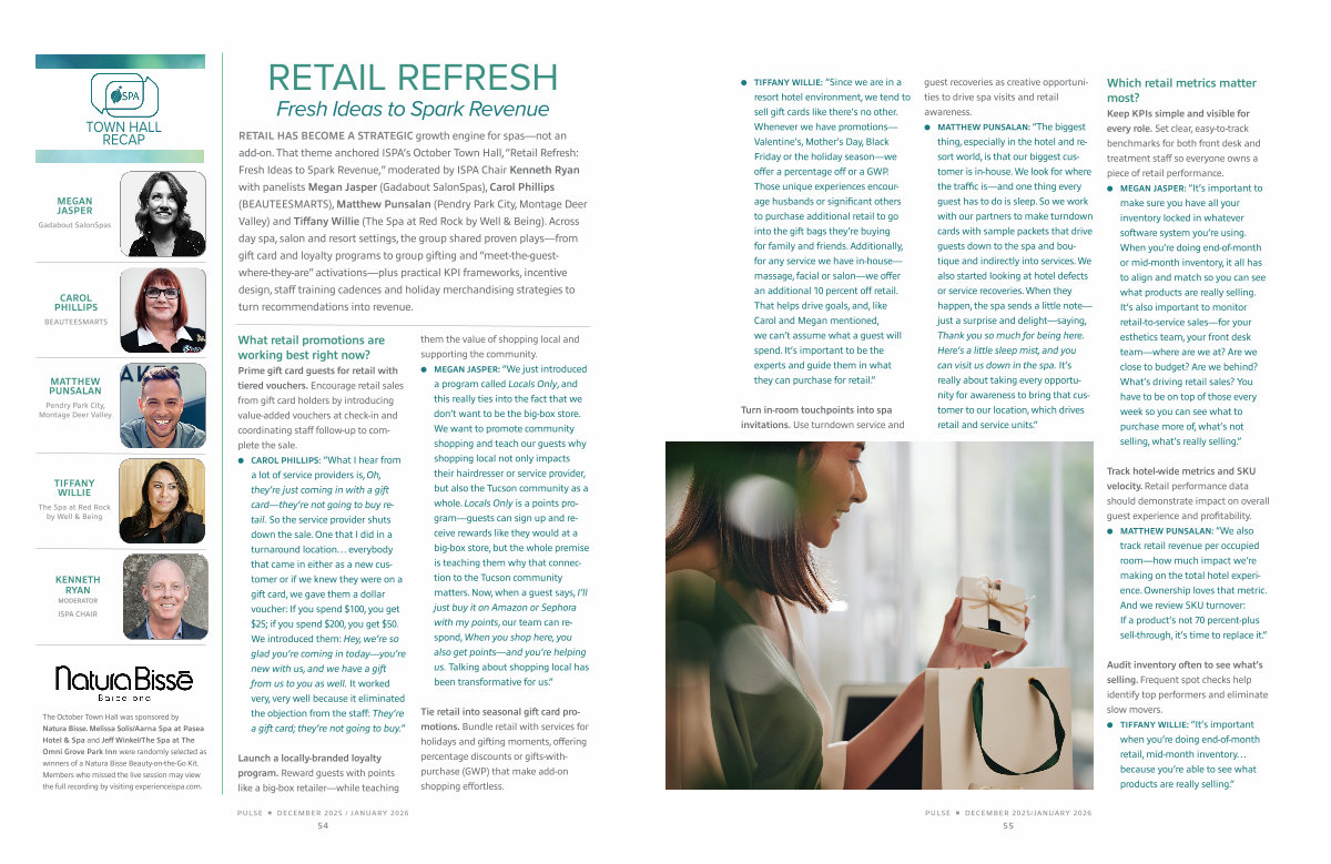 Turn in-room touchpoints into spa invitations. Use turndown service and guest recoveries as creative opportunities to drive spa visits and retail awareness. l MATTHEW PUNSALAN:“ The biggest thing, especially in the hotel and resort world, is that our biggest customer is in-house. We look for where the traffic is— and one thing every guest has to do is sleep. So we work with our partners to make turndown cards with sample packets that drive guests down to the spa and boutique and indirectly into services. We also started looking at hotel defects or service recoveries. When they happen, the spa sends a little note— just a surprise and delight— saying, Thank you so much for being here. Here’ s a little sleep mist, and you can visit us down in the spa. It’ s really about taking every opportunity for awareness to bring that customer to our location, which drives retail and service units.”