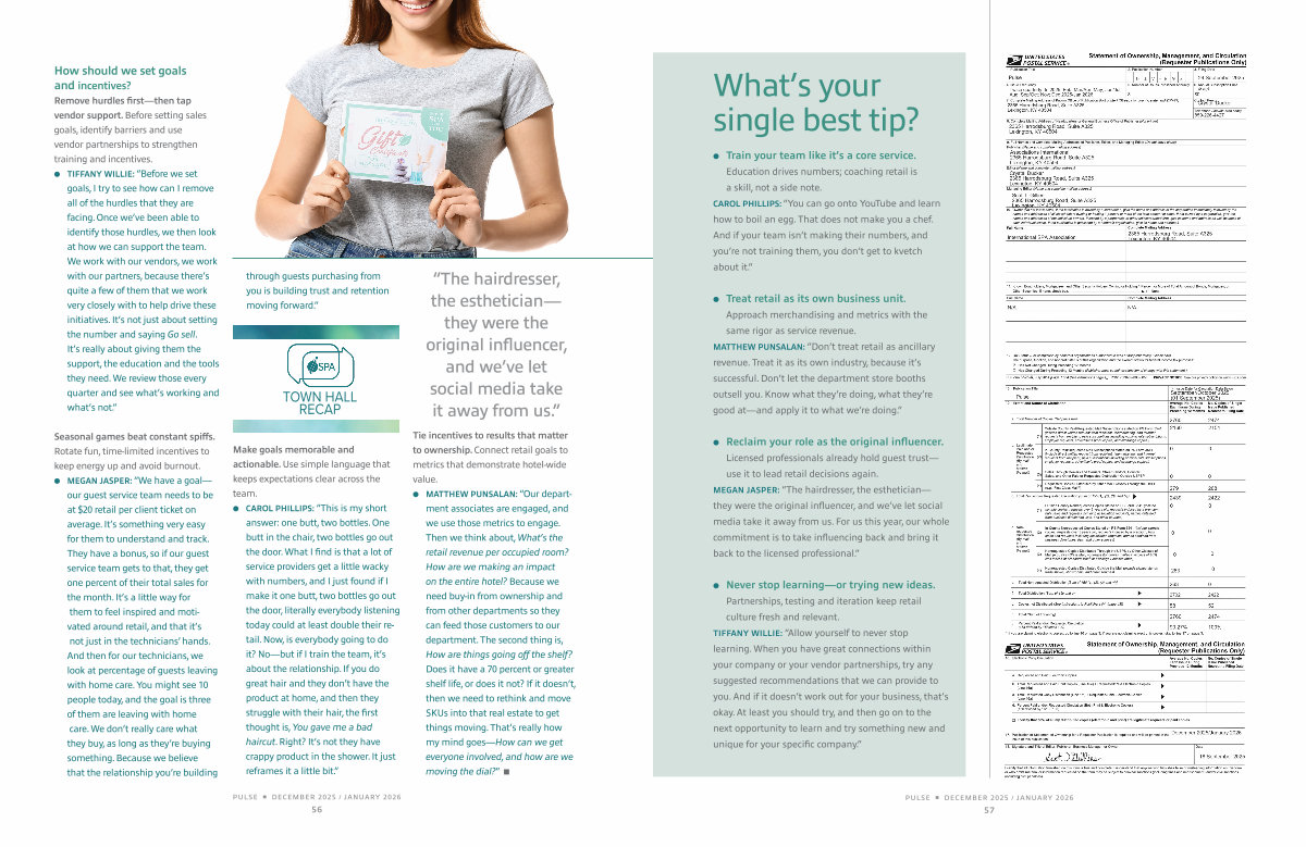 Seasonal games beat constant spiffs. Rotate fun, time-limited incentives to keep energy up and avoid burnout. l MEGAN JASPER:“ We have a goal— our guest service team needs to be at $ 20 retail per client ticket on average. It’ s something very easy for them to understand and track. They have a bonus, so if our guest service team gets to that, they get one percent of their total sales for the month. It’ s a little way for them to feel inspired and motivated around retail, and that it’ s not just in the technicians’ hands. And then for our technicians, we look at percentage of guests leaving with home care. You might see 10 people today, and the goal is three of them are leaving with home care. We don’ t really care what they buy, as long as they’ re buying something. Because we believe that the relationship you’ re building through guests purchasing from you is building trust and retention moving forward.”