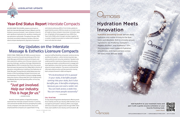 AS 2025 CAME TO A CLOSE, progress continued on both the Interstate Massage Compact( IMpact) and the Esthetics Licensure Compact— two initiatives in the U. S. with significant implications for workforce mobility and spa operations nationwide. Throughout the year, ISPA remained committed to keeping members informed about compact developments, legislative momentum and industry advocacy efforts. From timely updates to expert-led discussions, ISPA has served as a trusted source of insight as these compacts move closer to broader adoption. A highlight of that engagement was ISPA’ s final Town Hall of 2025, which brought members together for a candid, in-depth conversation on where both compacts stand and what lies ahead.
