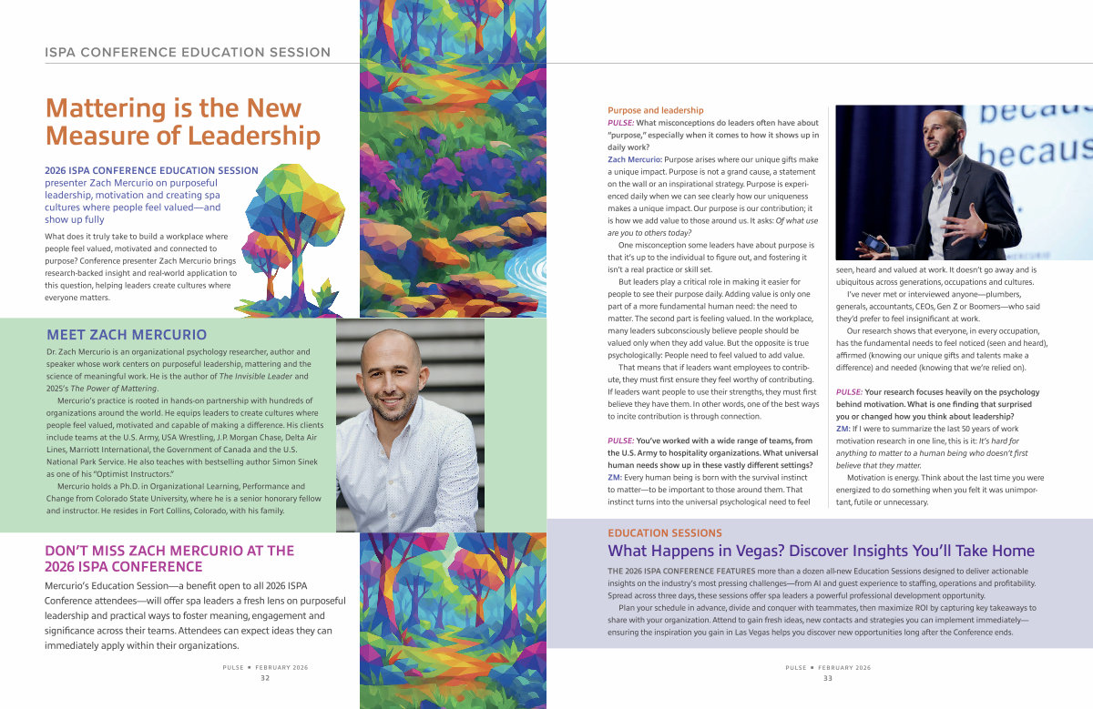 2026 ISPA CONFERENCE EDUCATION SESSION presenter Zach Mercurio on purposeful leadership, motivation and creating spa cultures where people feel valued— and show up fully