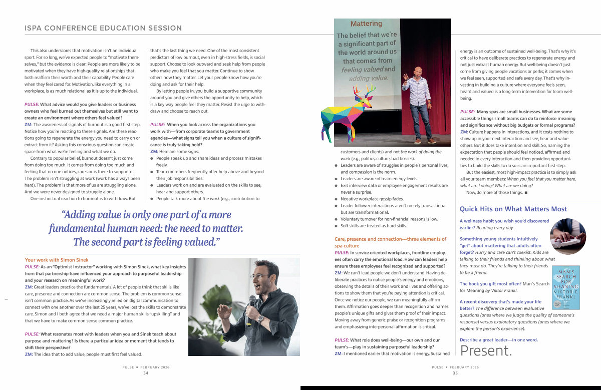 PULSE: What resonates most with leaders when you and Sinek teach about purpose and mattering? Is there a particular idea or moment that tends to shift their perspective? ZM: The idea that to add value, people must first feel valued.