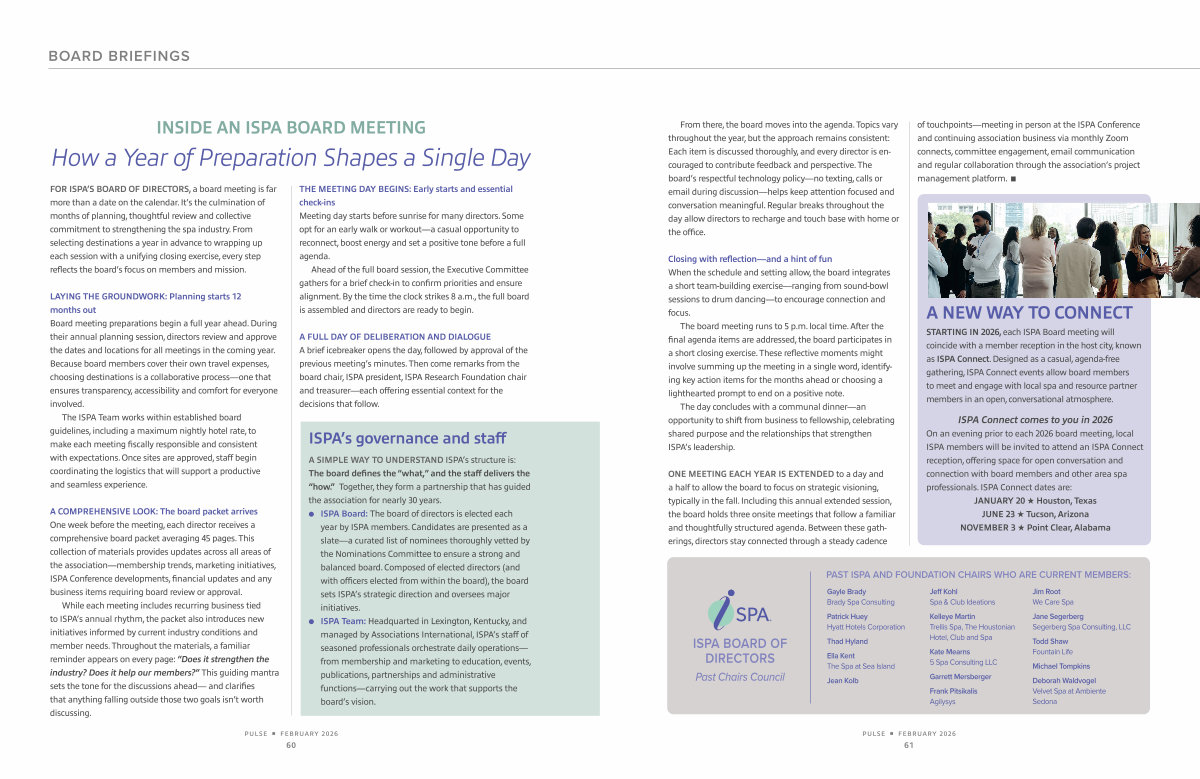 FOR ISPA’ S BOARD OF DIRECTORS, a board meeting is far more than a date on the calendar. It’ s the culmination of months of planning, thoughtful review and collective commitment to strengthening the spa industry. From selecting destinations a year in advance to wrapping up each session with a unifying closing exercise, every step reflects the board’ s focus on members and mission.