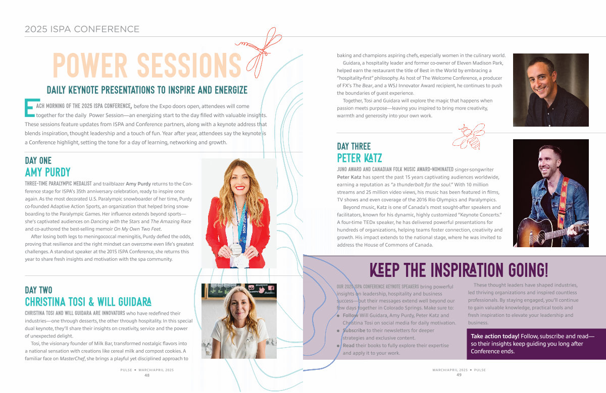 OUR 2025 ISPA CONFERENCE KEYNOTE SPEAKERS bring powerful insights on leadership , hospitality and business success — but their messages extend well beyond our few days together in Colorado Springs . Make sure to :