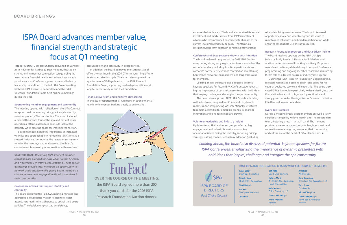 Strenthening member engagement and community The meeting opened with reflection on the ISPA Connect reception held the evening prior, graciously hosted by member property The Houstonian. The event included a behind-the-scenes tour of the spa and back-of house operations, offering attendees an inside look at the property while creating space for informal connection.