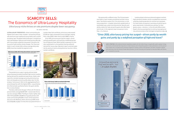 ULTRA-LUXURY PROPERTIES— those commanding the highest room rates in their markets— are posting striking rate premiums over traditional luxury hotels, even as their occupancy lags. The global hotel landscape is marked by a clear split between high-end and limited-service offerings, with luxury hotels outperforming overall. Yet within the luxury tier itself, another divide emerges: The 10 priciest hotels in each market often achieve average daily rates( ADR) more than double the segment norm.