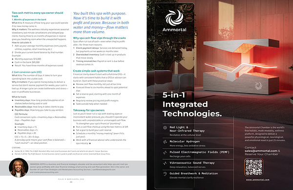 1. Months of expenses in the bank What it is: A measure of how long your spa could operate if no new money came in. Why it matters: The wellness industry experiences seasonal slowdowns, last-minute cancellations and delayed payments. Having three to six months of expenses in reserve gives you breathing room when the unexpected happens. How to calculate it: 1 Add up your average monthly expenses( rent, payroll, utilities, supplies, retail inventory, etc.). 2 Divide your current bank balance by that number. Example: l Monthly expenses: $ 15,000 l Cash in the bank: $ 45,000 l Result: You have three months of expenses saved.