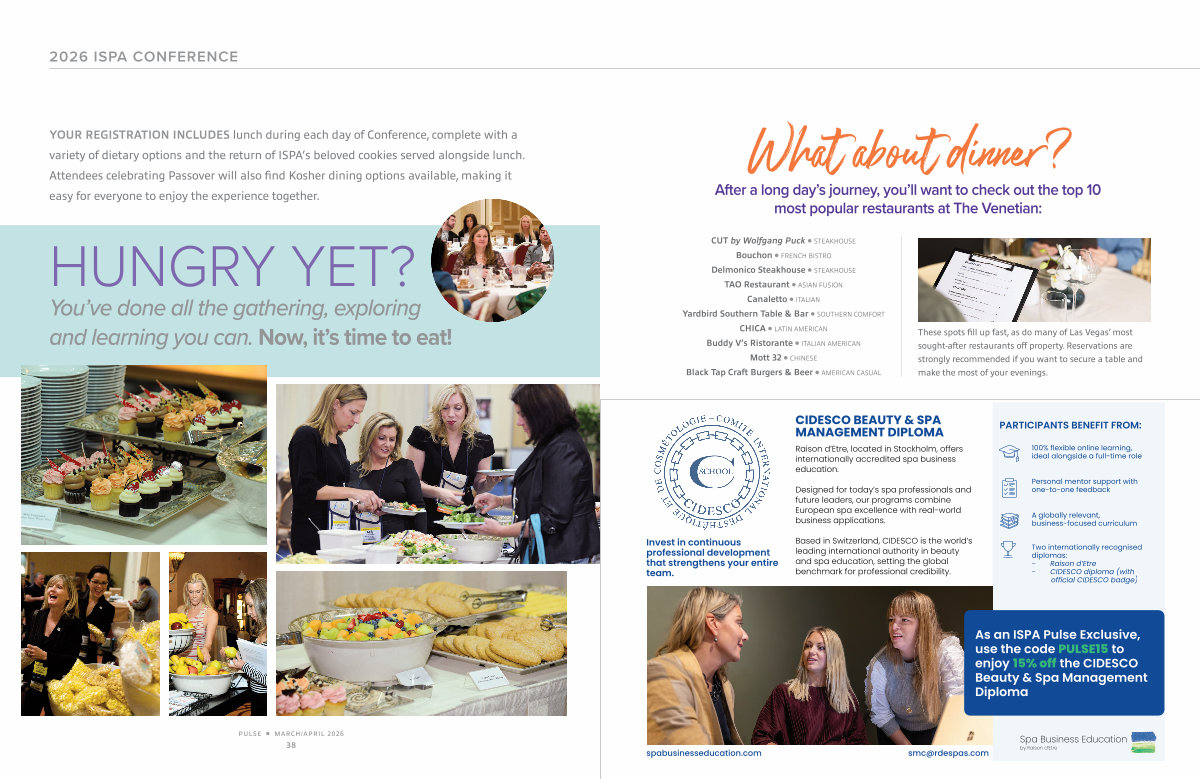 As an ISPA Pulse Exclusive, use the code PULSE15 to enjoy 15 % off the CIDESCO Beauty & Spa Management Diploma spabusinesseducation. com smc @ rdespass. com