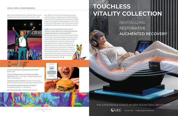 PULSE: You recommend leaders step into their customers’ shoes. What’ s the most eye-opening thing a leader typically learns when they do this? DG: When you become a customer of your own business, you see it from precisely the opposite perspective. This is critical. Walk in the front door of your spa and notice if there are fingerprints on the door. Look around the waiting room to see if it looks comfortable, if the magazines are current, if there are sample products to try or available mints. Sign up for a massage or other procedure at your own spa so you can literally feel what your customers feel. Schedule it online so you go through that process. Visit your bathroom and note how you feel. Pay attention to everything, and the ideas will come! n
