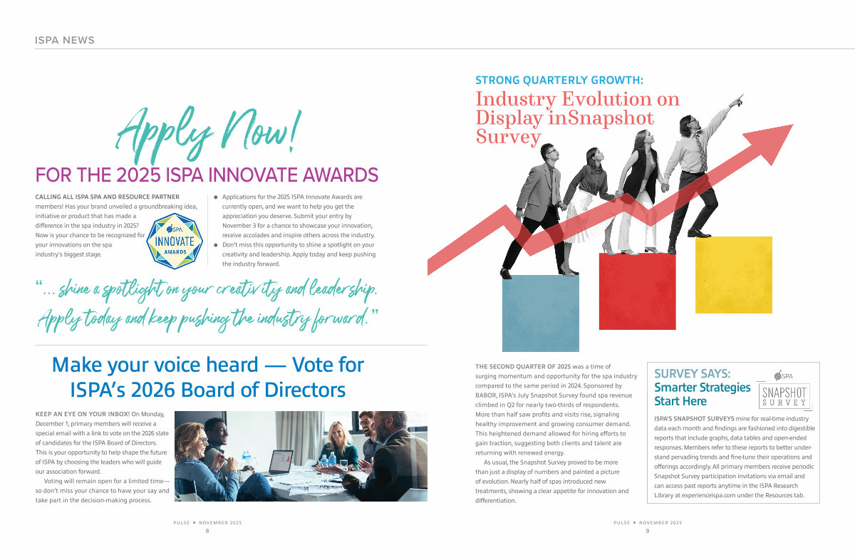 THE SECOND QUARTER OF 2025 was a time of surging momentum and opportunity for the spa industry compared to the same period in 2024. Sponsored by BABOR, ISPA’ s July Snapshot Survey found spa revenue climbed in Q2 for nearly two-thirds of respondents. More than half saw profits and visits rise, signaling healthy improvement and growing consumer demand. This heightened demand allowed for hiring efforts to gain traction, suggesting both clients and talent are returning with renewed energy.