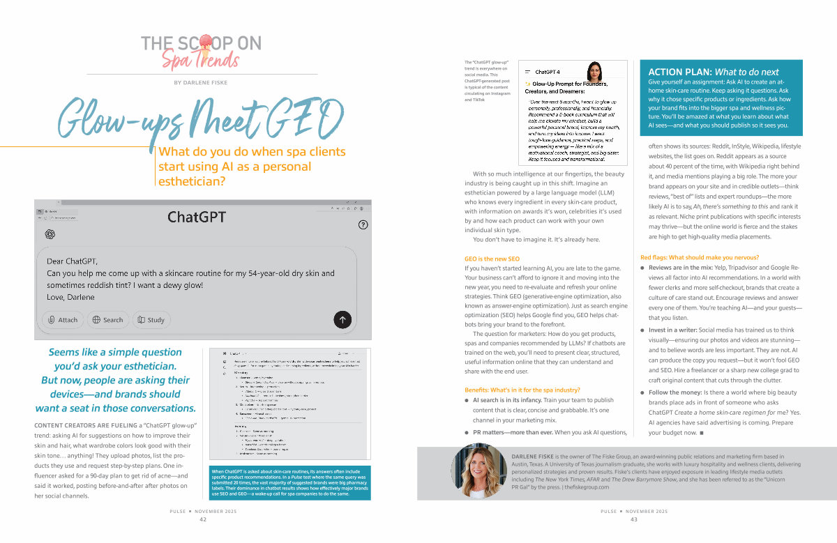 When ChatGPT is asked about skin-care routines, its answers often include specific product recommendations. In a Pulse test where the same query was submitted 20 times, the vast majority of suggested brands were big pharmacy labels. Their dominance in chatbot results shows how effectively major brands use SEO and GEO— a wake-up call for spa companies to do the same.