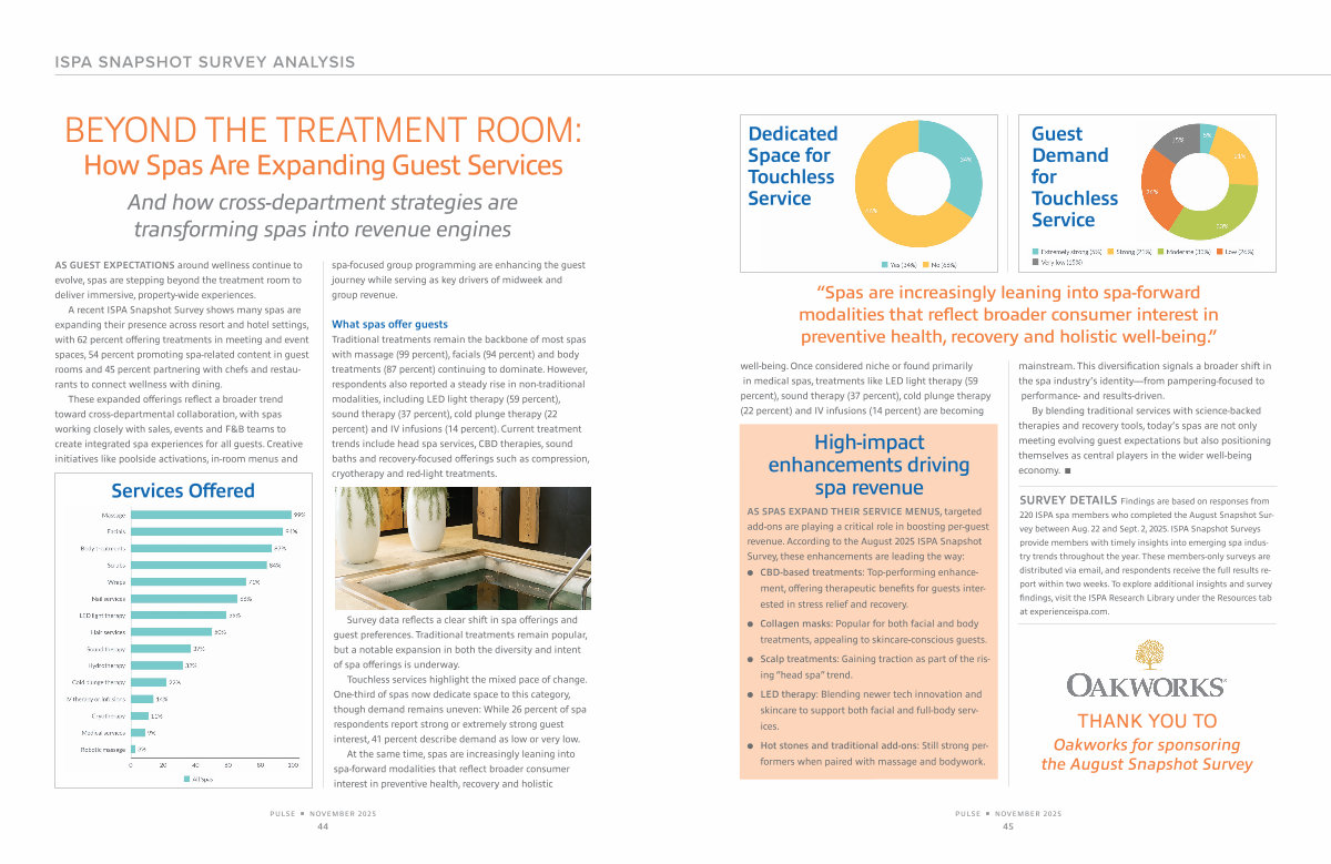 A recent ISPA Snapshot Survey shows many spas are expanding their presence across resort and hotel settings, with 62 percent offering treatments in meeting and event spaces, 54 percent promoting spa-related content in guest rooms and 45 percent partnering with chefs and restaurants to connect wellness with dining.
