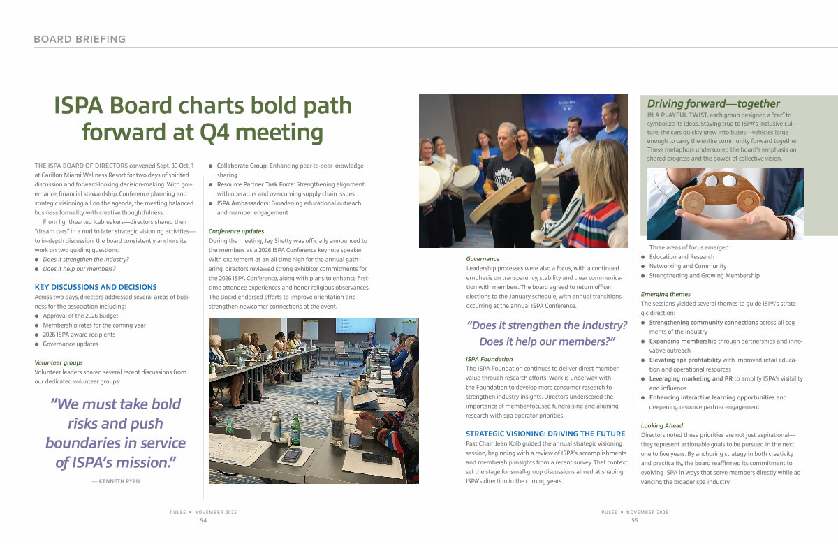 THE ISPA BOARD OF DIRECTORS convened Sept. 30-Oct. 1 at Carillon Miami Wellness Resort for two days of spirited discussion and forward-looking decision-making. With governance, financial stewardship, Conference planning and strategic visioning all on the agenda, the meeting balanced business formality with creative thoughtfulness.