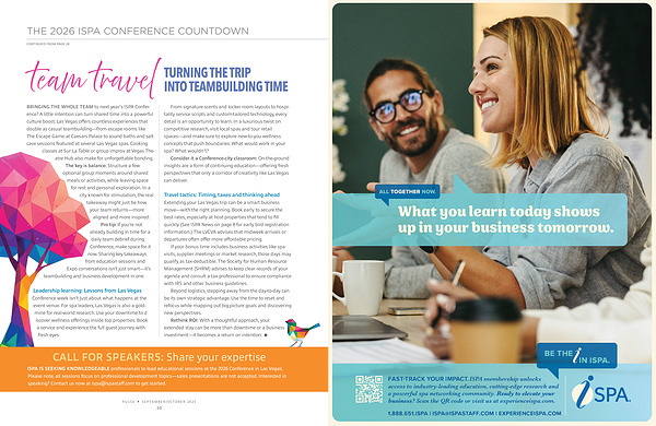 BRINGING THE WHOLE TEAM to next year’ s ISPA Conference? A little intention can turn shared time into a powerful culture boost. Las Vegas offers countless experiences that double as casual teambuilding— from escape rooms like The Escape Game at Caesars Palace to sound baths and salt cave sessions featured at several Las Vegas spas. Cooking classes at Sur La Table or group improv at Vegas Theatre Hub also make for unforgettable bonding. The key is balance: Structure a few optional group moments around shared meals or activities, while leaving space for rest and personal exploration. In a city known for stimulation, the real takeaway might just be how your team returns— more aligned and more inspired. Pro tip: If you’ re not already building in time for a daily team debrief during Conference, make space for it now. Sharing key takeaways from education sessions and